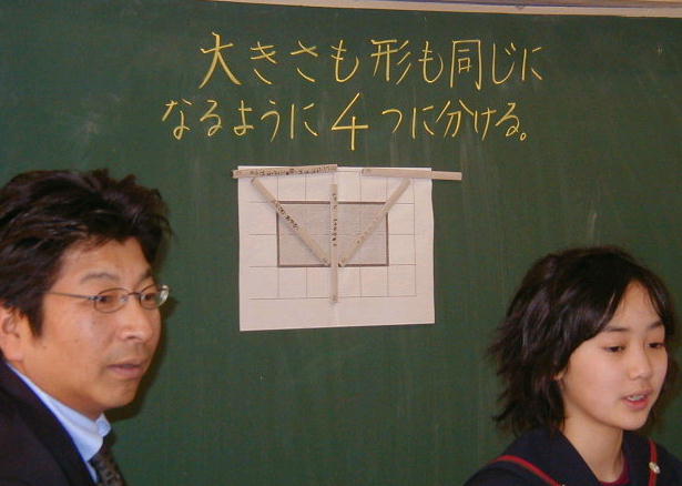 今回の公開では、5年生が「多数の料理から3つの質問により予め選んでおいた1つの料理を推理する」という「ことば・トレーニング」、6年生が「図形を同じ形、同じ面積に分割する」という「算数ワールド」の実践を提案した。